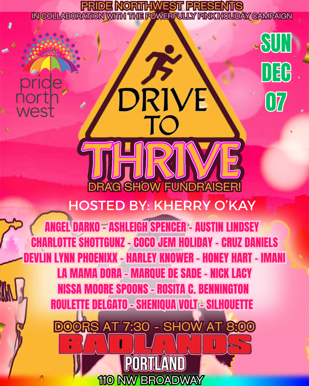 Get ready for Drive to Thrive, a high-energy drag show fundraiser bringing together Portland’s vibrant and talented queer communities! Expect a jaw-dropping, show-stopping evening packed with drag performances, sand-up comedy, live music, and surprises throughout the night.